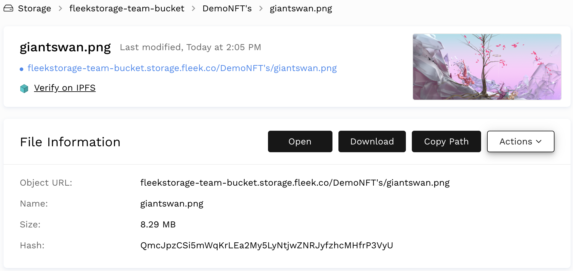 When you open an individual file you can see details about that particual file including the Image Preview, Object URL, Name, Size, and the IPFS Hash.